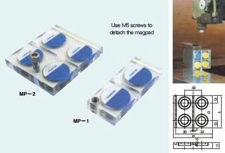 • The Magpad is a device to prevent wire breakage by heat due to aerial discharge. It protects wire electrodes of wire electric discharge machines from separation of cooling liquid which is likely to occur at the start of discharging. • This Magpad can also be used to prevent dislocation or dropping of cut workpieces at the start or end of cutting.