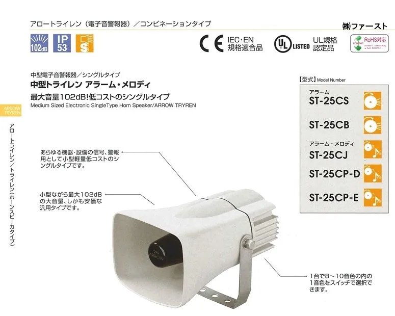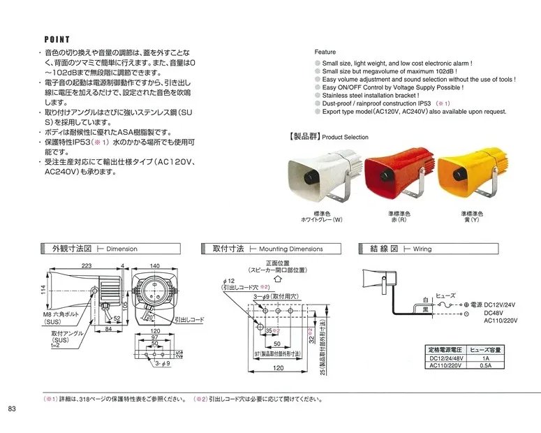 ● Small size, light weight, and low cost electronic alarm ! ● Small size but megavolume of maximum 102dB ! ● Easy volume adjustment and sound selection without the use of tools ! ● Easy ON/OFF Control by Voltage Supply Possible ! ● Stainless steel installation bracket ! ● Dust-proof / rainproof construction IP53 (*1) ● Export type model (AC120V, AC240V) also available upon request.