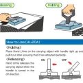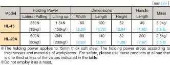 • A new cam mechanism is employed so as not to apply friction due to holding and releasing directly to the surface of workpieces to transport. (HL-20A) • Workpieces are held and released quite smoothly. • The magnetic force can be turned on and off by lever operation. (HL-15) • The T-handle is robust and fixed for stable workpiece transportation. (HL-15)