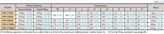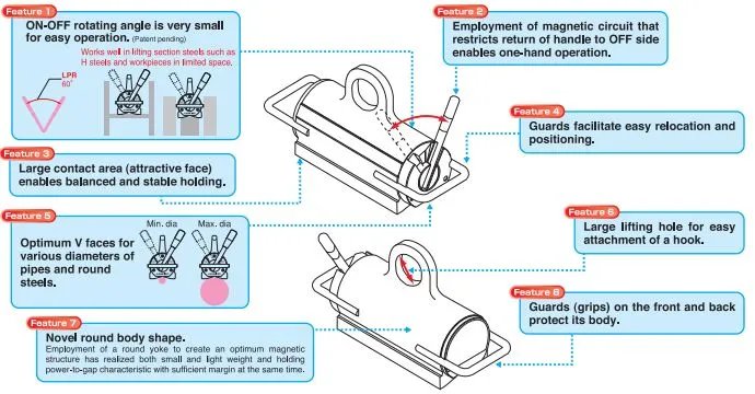 • All models are capable of lifting steel plates and round steels. • Since a permanent magnet is used, no electricity is required and a risk associated with power failure and wiring breakage is eliminated. • Very strong holing power, yet small and light weight. The mounting and dismounting (ON/OFF) mechanism can be operated easily. • Such a safety feature is incorporated that disables ON/OFF if a workpiece thicker than the standard (see Kanetec Lifting Standard) is not attracted to the attractive face. • The lever is designed so as not to return rapidly at OFF in consideration of safety and durability.