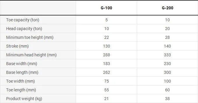 G-60 G-100 G-160 G-200 Toe capacity (ton) 3 5 8 10 Head capacity (ton) 6 10 16 20 Minimum toe height (mm) 19 22 25 28 Stroke (mm) 115 130 136 140 Minimum head height (mm) 233 288 297 333 Base width (mm) 155 183 200 230 Base length (mm) 236 262 285 300 Toe width (mm) 65 75 90 100 Toe length (mm) 50 55 55 60 Product weight (kg) 13 21 28 38