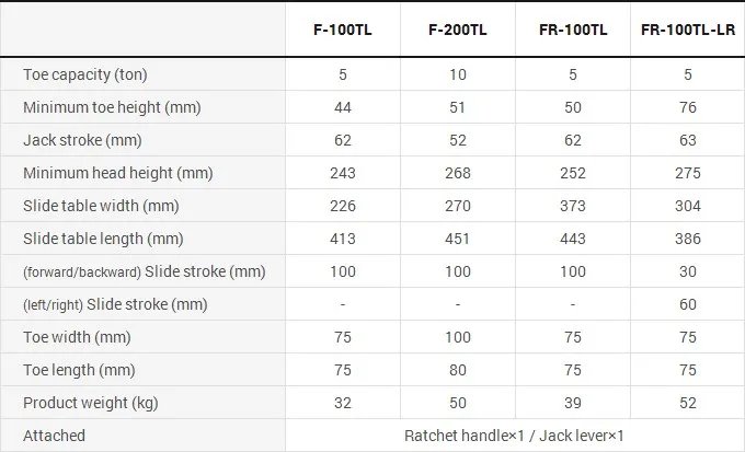 Toe-Lift Jacks with Slide Table (F-TL Series) They enable forward/backward position adjustment while keeping heavy load in a jacked position.