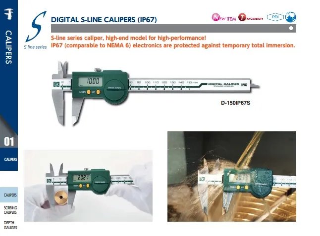 ● S-line series caliper, high-end model for high-performance! IP67 (comparable to NEMA 6) electronics are protected against temporary total immersion. ● For outside diameter, inside diameter step and depth measurement ● Stainless steel ● Swiss made