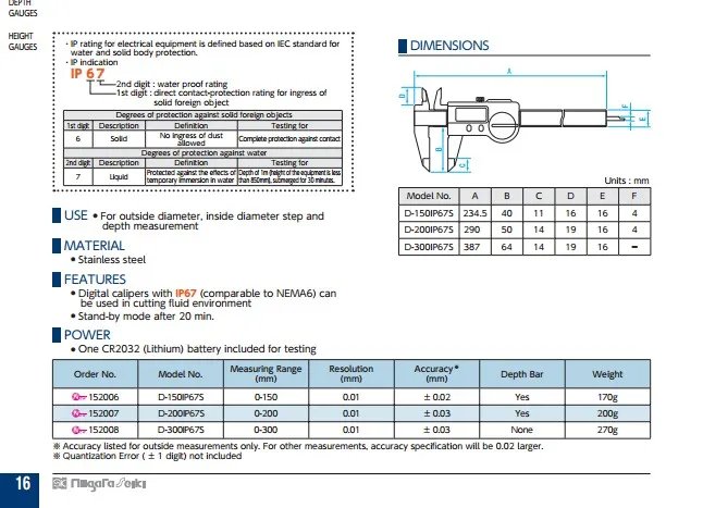 ● Digital calipers with IP67 (comparable to NEMA6) can be used in cutting fl uid environment ● Stand-by mode after 20 min. ● One CR2032 (Lithium) battery included for testing