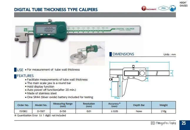 ● Facilitate measurements of tube wall thickness ● The main scale jaw is a round bar ● Hold display function ● Auto power off function(after 20 min.) ● Made of stainless steel ● One SR44 (Silver oxide) battery included for testing ● Made of stainless steel USE ● For measurement of tube wall thickness FEATURES ● Facilitate measurements of tube wall thickness ● Hold display function ● Auto power off function(after 20 min.)
