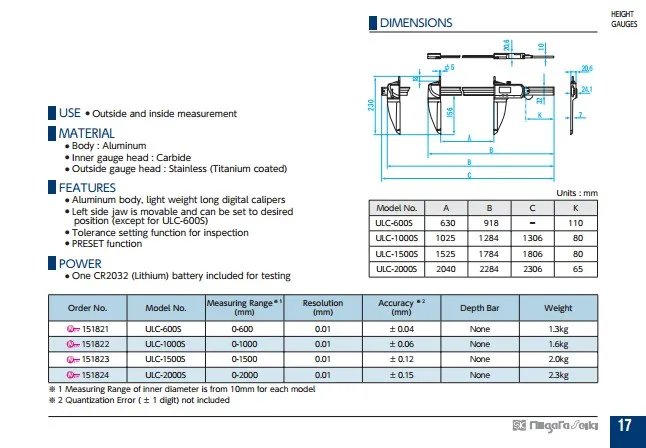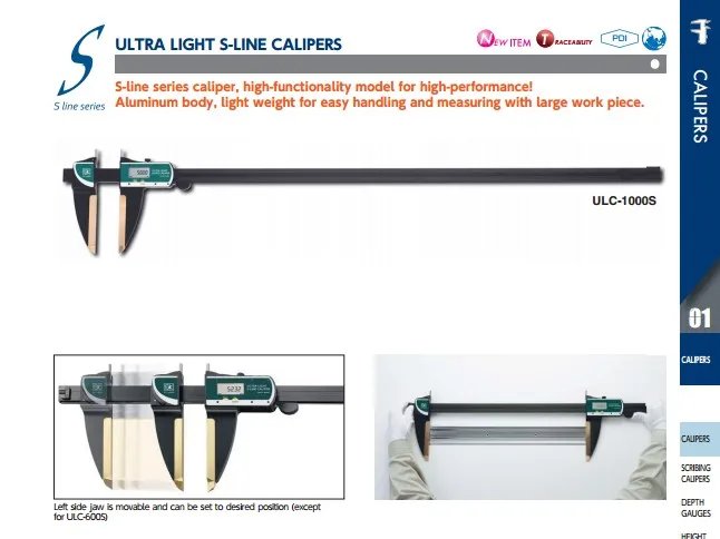 ● Aluminum body, light weight long digital calipers ● Left side jaw is movable and can be set to desired position (except for ULC-600S) ● Tolerance setting function for inspection ● PRESET function ● One CR2032 (Lithium) battery included for testing