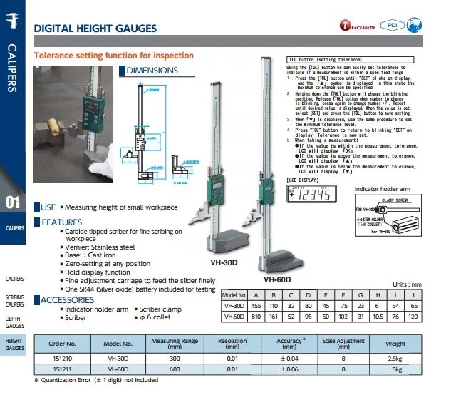 FEATURES ● Carbide tipped scriber for fi ne scribing on workpiece ● Vernier: Stainless steel ● Base: :Cast iron ● Zero-setting at any position ● Hold display function ● Fine adjustment carriage to feed the slider finely ● One SR44 (Silver oxide) battery included for testing