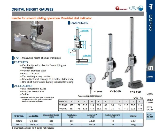 ● Carbide tipped scriber for fi ne scribing on workpiece ● Vernier: Stainless steel ● Base: :Cast iron