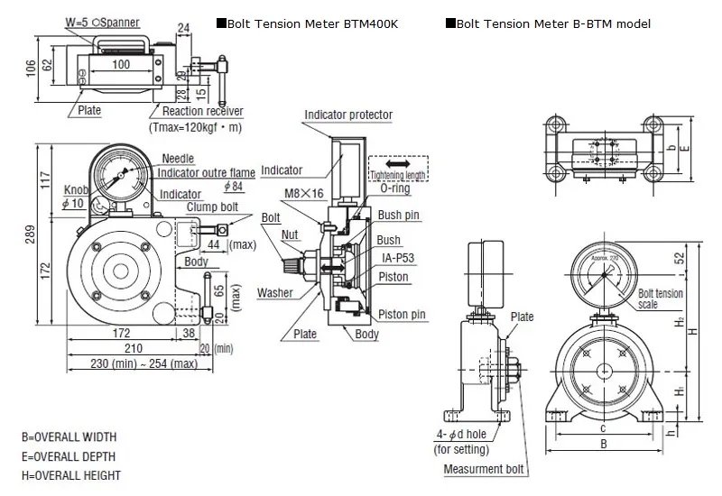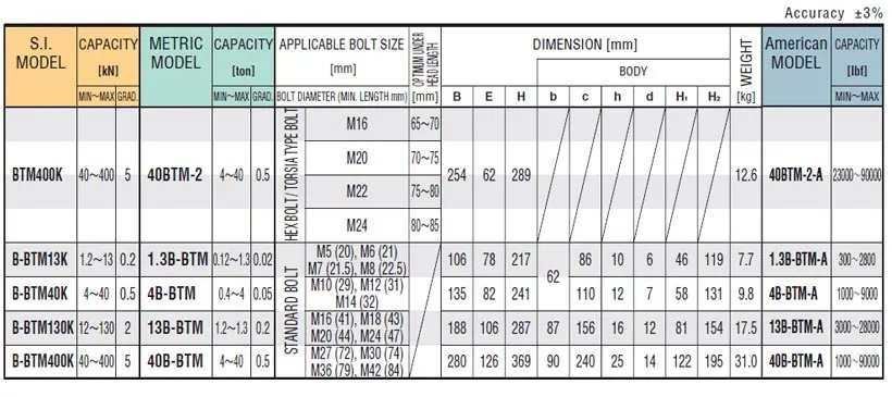 • The tension is directly measured while the bolt is tightened. The optimum tightening torque can be determined. • By combining the meter with the torque wrench, the meter is used for various applications, such as measurements of bolt strength and torque coefficient, etc. • The hydraulic system meter is very durable and robust instrument. Since the shock absorber has been assembled in the hydraulic circuit, it is available for impact and impulse wrenches. • One set of bushings and plates are supplied as standard accessory to adapt to standard test bolts. • BTM400K is a compact and portable meter, especially designed for tension verification test of torsia type high tension bolts in the construction field.