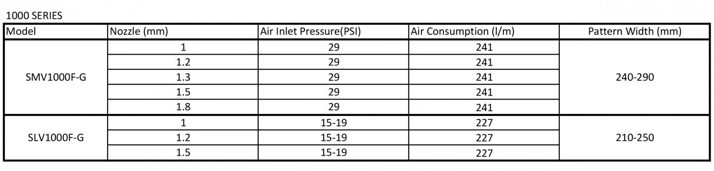SMV1000F-G High transfer efficiency and ultra fine atomization ensures cost savings and excellent results with low atomization pressure of 29-35 PSI.