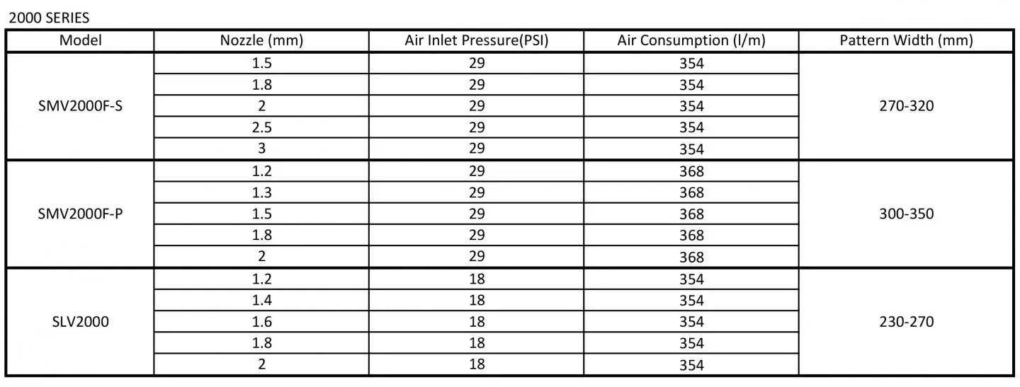 SMV2000F-S & SMV2000F-P High transfer efficiency and ultra fine atomization ensures cost savings and excellent results with low atomization pressure of 29-35 PSI.