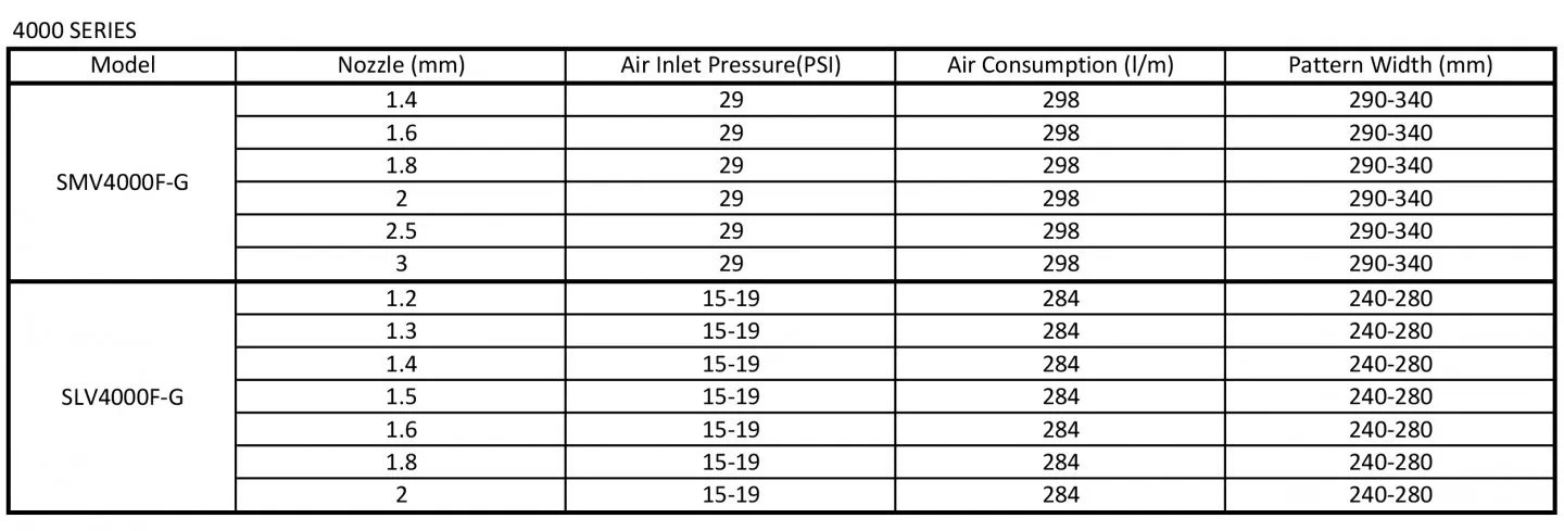SMV4000F-G High transfer efficiency and ultra fine atomization ensures cost savings and excellent results with low atomization pressure of 29-35 PSI. SLV4000F-G High transfer efficiency and ultra fine atomization ensures cost savings and excellent results with low atomisation pressure from 15 PSI. With a large range of setups available EVO-T guns are suitable for any high quality painting application including the new Waterborne Paint Technology.