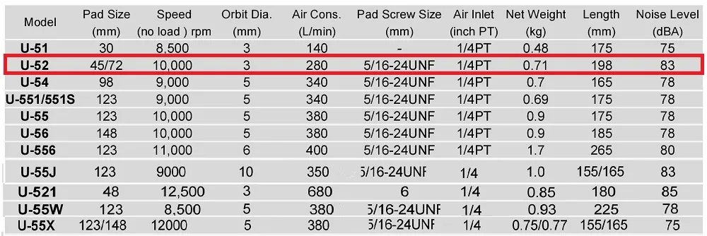 With U-TOOL's excellent sanding program, tools are of low vibration, low gravity center, well-balanced. Mini double action sander. with Velcro pads 45mm(1.8") dia. and 72mm(2.8") dia. and buffering disc 50mm(4") dia.
