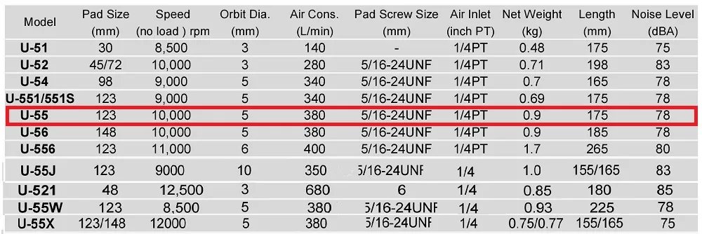 With U-TOOL's excellent sanding program, tools are of low vibration, low gravity center, well-balanced. 5" Double action sander with pad 123mm dia. & speed regulator