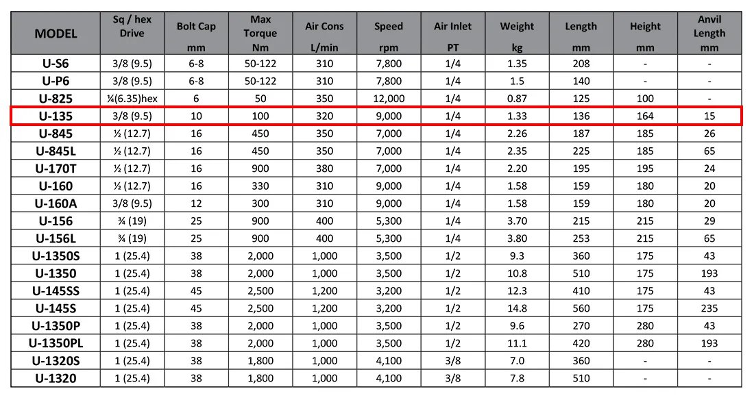 Air impact wrench, impact wrench, pneumatic tool, air tools, air tool, 3/8', 3/8 inch, 9,5 square drive, u-135