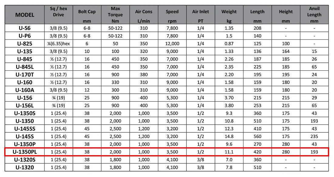 Model : U-1350PL Sq/Hex Drive : 1” (25.4mm) Bolt Cap : 38mm Max Torque : 2,000mm Air Cons : 1,000L/min Speed : 3,500rpm Air Inlet : 1/2PT Weight : 11.1kg Length : 420mm Height : 280mm Anvil Length : 193mm
