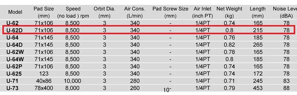 High efficiency by strong motor, low vibration and low gravity center. Less fatigue by well-balanced ergonomical design. Dust free orbital sander 71mm x 106mm with speed regulator & air exhaust hose 1.6m