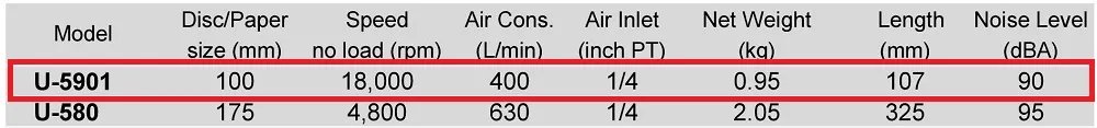 Pad/Disc Size 70mm ; Free Speed 18,000 rpm ; Air Cons. 380 L/min ; Air Inlet 1/4PT