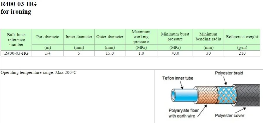 Features: Contains a thick polyester braided cover Flexible and durable An additional air layer keeps surface temperature low Long life and easy handling Tags: Ironing hose, steam hose, press hose, press machine hose, high temperature hose, laundry hose, steam washing