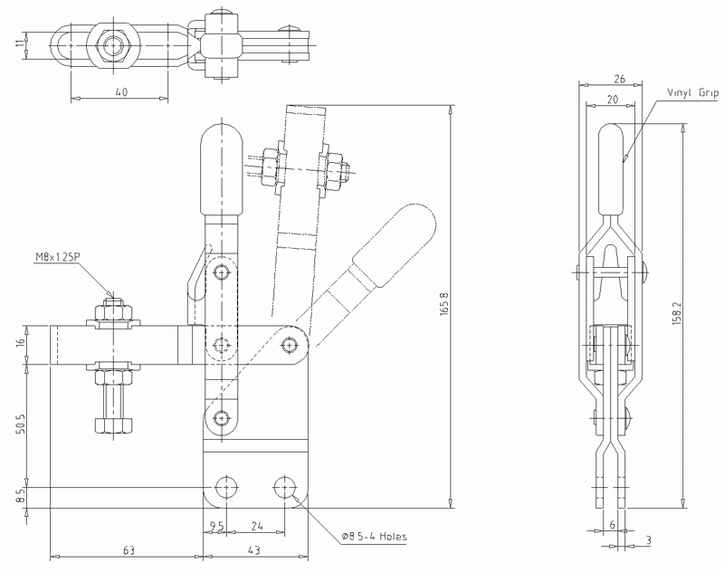 Holding Capacity : 150 Kgs. Weight : 390 g. Handle Moves : 45° Bar Moves : 94°