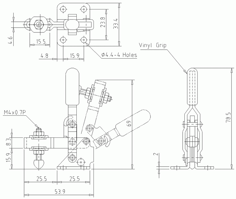 The smallest vertical handle clamp is applicable for light duty. Supplied with vinyl-coated hex-head spindle assemblies and two flanged washers.