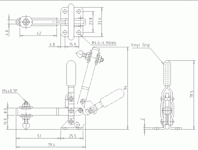 Holding Capacity : 27 Kgs. Weight : 80 g. Handle Moves : 60° Bar Moves : 105°