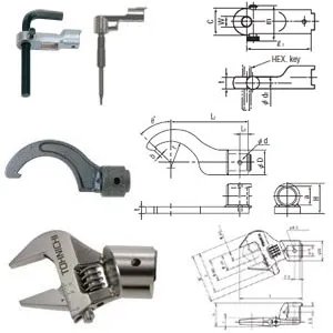 • The SH type spanner heads suit for the place where sockets can not be used, for flare nuts in piping and for work in narrow places. • Notched head enables quick motion of tightening, saving the trouble of removing the head from the nut each time of tightening. The SH-N series are ideal for brake lines. • The RH type ring heads guarantee the safe work as the axes of bolt and RH ring head are always aligned and prevent the heads will drop. • As the QH type ratchet heads need only small swing for tightening, they suit for operations in narrow spaces. • As the RQH type ratchet heads need only small swing for tightening, they suit for operations in narrow and low ceiling spaces. • The DH square drive heads are the standard interchangeable head. They are useful when tightening a large number of matching screws with a common torque wrench. It is recommended to keep one set. They are used with sockets. • The HH hex-head is for hex. socket head cap screws. • The AH type heads are inner-width adjustable and suitable for hydraulic or pneumatic pipe tightening, maintenance works, inch size screw management, etc.
