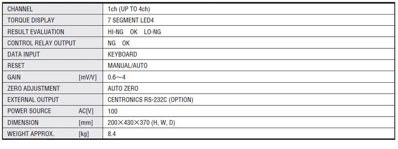 • Torque display, "OK" or "NG" judgment, control and data processing can be performed with built-in micro computer. • Micro computer displays torque, judges, "OK" or "NG", controls signal and transfers data of each sensor up to 4 sensors in the nutrunners. • The judgment result of "OK" or "NG" can be transmitted to lamp or external output. • Data can be downloaded to PC or printer. • The software can easily be modified to meet various requirements.