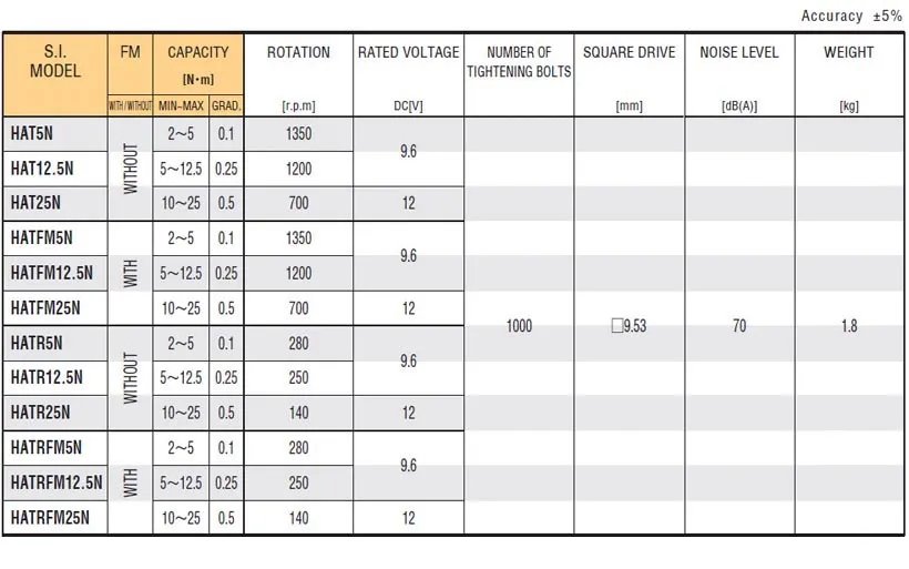 • Battery version of AUR model. • Compact size and high power. • Battery operated (DC9.6V, 12V) and wireless type, easy to carry. • Quick and easy torque setting with torque graduation. • Easy torque measurement by torque wrench tester. • HATFM wireless type can be connected to CNA-4mk2 (option) to eliminate missed tightening. • HATR-type: used for both clockwise and counterclockwise directions.