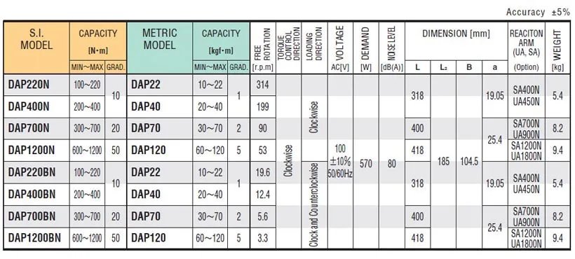 • Electric version of AP model. • Automatic torque converter enables stable bolt tightening high speed for provisional tightening and low speed for final precise tightening. • DAP can be used with AC100V power source. • Easy torque adjustment with graduation. • Unlock device releases all reaction forces which prevents the removal of the tool after the bolt has been driven to the desired torque. • Reaction force is automatically and safely absorbed in any position with a universal reaction arm. • Since the reaction arm rotates free, the positioning can easily be made by moving the reaction arm.