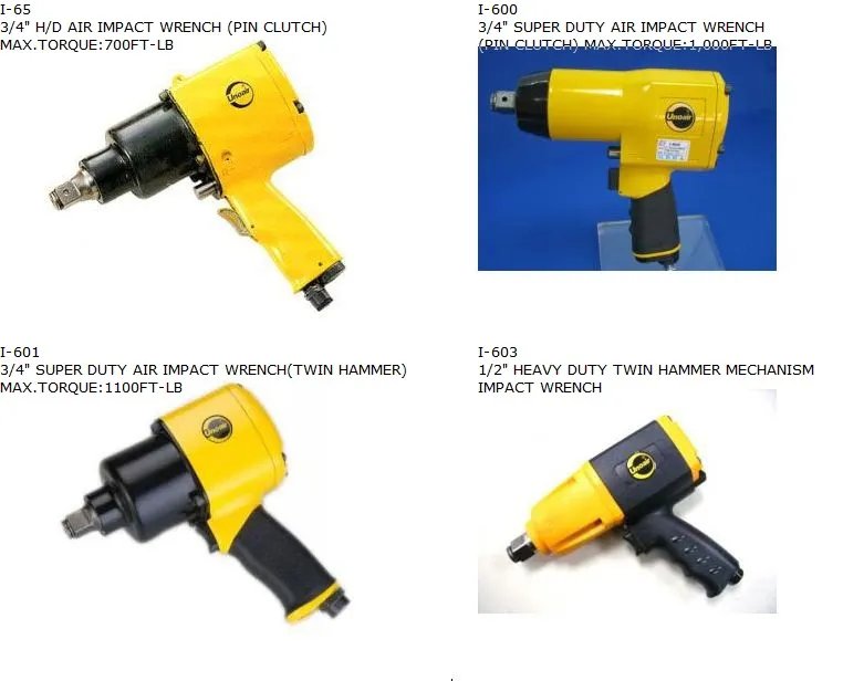 UNOAIR is a specialized impact wrench manufacturer. Our products include a variety of impact wrenches. Pistol type wrench, suitable for general automotive service and general garage work, are mechanized by pin clutch or twin hammer. We take pride in stability and reliablity of our products with ISO-9001 and CE certifications . Should you have any question, don't hesitate to inquire us. Your inquiry is our top priority!