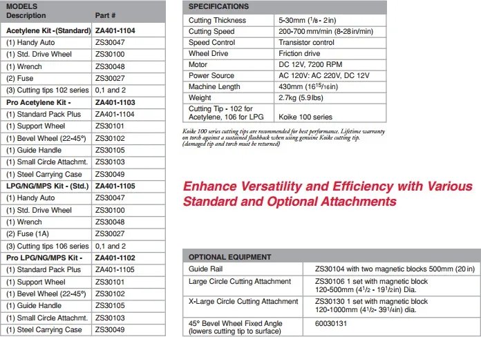 ■ High Quality Tips Koike’s superior design Series 100 torch tips are included to ensure fast, smooth cuts