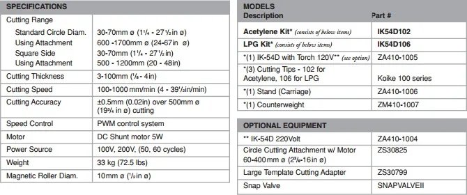 Low Cost - Built for Efficient, High Production Operation The IK-54D is a precision, quality constructed, hard-working gas shape cutter built for high production. Compact and simple to operate, this machine excels at repetitive work, continuously producing accurate flame cuts by following a steel template. A powerful magnetic roller smoothly guides the cutting torch around any shape, cutting steel plate up to 4 inches thick. The Koike IK-54D offers all the convenient features of more expensive models with all the dependability and efficiency needed for your applications.
