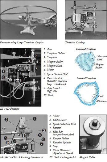 Operations Template manufacturing is a simple process and as shown in the diagrams below, allowance is easily made for the diameter of the tracing roller as well as for kerf, with both external and internal templates. Once constructed, the template is quickly attached to the holder with a suitable size tip. The direction changeover switch is then flipped to either right or left handed rotation. Power travels to the magnetic roller motor where speed can be adjusted from 100 to 1,000mm (4 to 39 1/2) per minute.
