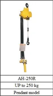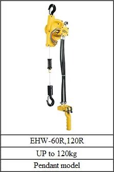 • Contribute to the improvement of working efficiency and worker's fatigue. • Suit the work of which high speed is required, such as material lifting etc. • Employ an air motor and no electric power is required. • Work with stepless speed control. • Include a reverse winding prevention device which actuates at 2m wire rope pay out. This is available for reverse winding prevention. (EHW series only) • Limitation mechanism is applied to EHL series.