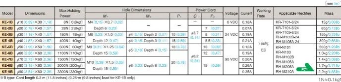 • Special cables that have specially high durability against bending and vibration are used. (Employed in all models except for KE-1B.) • Electrical control can be used for turning on and off the magnetic force and for remote on/off control. • Usable for continuous operation. • Finished by plating.