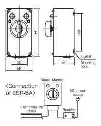 • Model ESR-N102 rectifies an input from an AC power source to DC and outputs it to electromagnetic chucks and for demagnetization, the attenuating alternating output is operated manually. A rectifier is built in. • Model ESR-5A relays the DC output to electromagnetic chucks and for demagnetization, the attenuating alternating output is operated manually. A rectifier needs to be installed in the preceding stage.