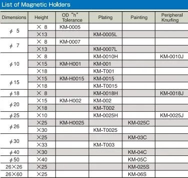 • Can be used to hold down drawings, rules and paper patterns. • The models with tapped holes on the back can be used widely by installing them on jigs. • Can be incorporated in press dies. • Can hold workpieces during wire cutting.
