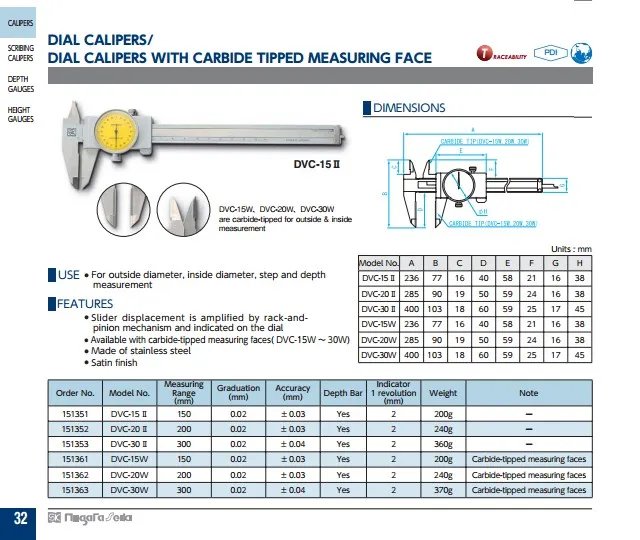 ● Slider displacement is amplified by rack-andpinion mechanism and indicated on the dial ● Made of stainless steel ● Available with carbide-tipped measuring faces( DVC-15W ~ 30W) ● Satin finish