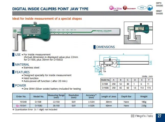 ● Stainless steel ● Designed specially for inside measurement ● Hold function ● Auto-power-off function ( after 20 min.) ● One SR44 (Silver oxide) battery included for testing