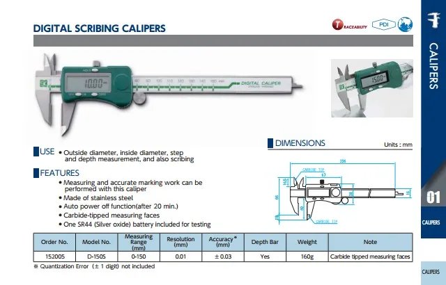 ● Measuring and accurate marking work can be performed with this caliper ● Made of stainless steel ● Auto power off function(after 20 min.) ● Carbide-tipped measuring faces ● One SR44 (Silver oxide) battery included for testing
