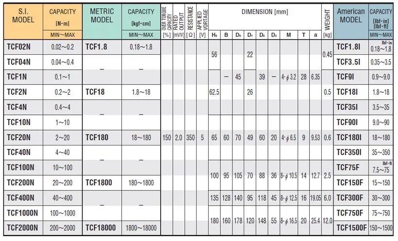 • Fixed type torque sensors. • Reaction type torque transducer that measures output of torque tools. • When a nutrunner is measured, test piece model TP (option), which absorbs impact applied to TCF, is used to simulate joint characteristics for measuring precise torque. • Suitable for installation into special machine, like preload detection.