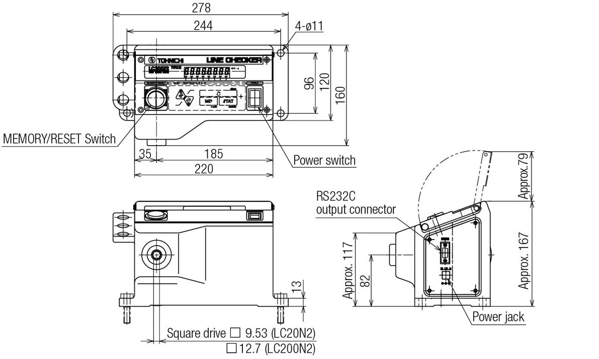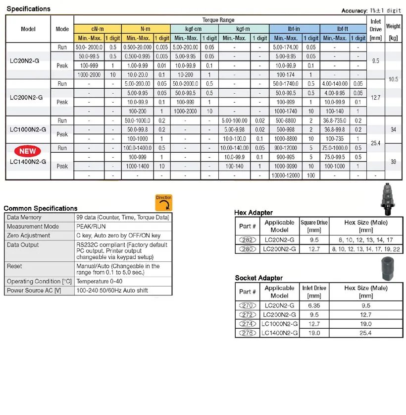 • Digital type. • Wide measurement range, reasonable price and compact size. The checker has all the features for daily check of torque wrenches on production lines. • The built-in clock keeps track of time and date when measurement was taken. • Since initial torque is picked up by this checker, over torque of click type, so called, second peak torque, does not affect the reading torque. • The internal memory function stores 50 data. The stored data can be easily output by a printer or PC through RS232C. • Adapters with combination free heads-hexagon heads can randomly be combined depending on the torque wrench checked. • Voltage requirements: AC100V - 240V. Battery pack (Option). • LC2-G has all 3 torque units in one model (Newton, Metric and American).