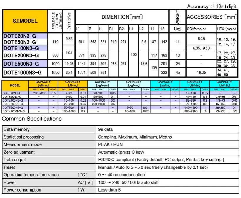 • Digital type. • Since measurements are performed by setting the torque wrench horizontally, wrench weight correction is not necessary. • Easy to operate with the "Auto Zero" function. • Since loads can be correctly applied to the effective length of the torque wrench with the loading device errors caused by improper application of force are considerably reduced. • Data memory capacity up to 99 readings. Sampling number of stored data, a maximum value (Hi), a minimum value (Lo) and a mean value can be displayed. • RS232C output allows for transmitting the data into a PC or a printer. • Power source: AC100V - 240V, available for battery pack. • DOTE3-G has all 3 torque units in one (Newton, Metric, and American).