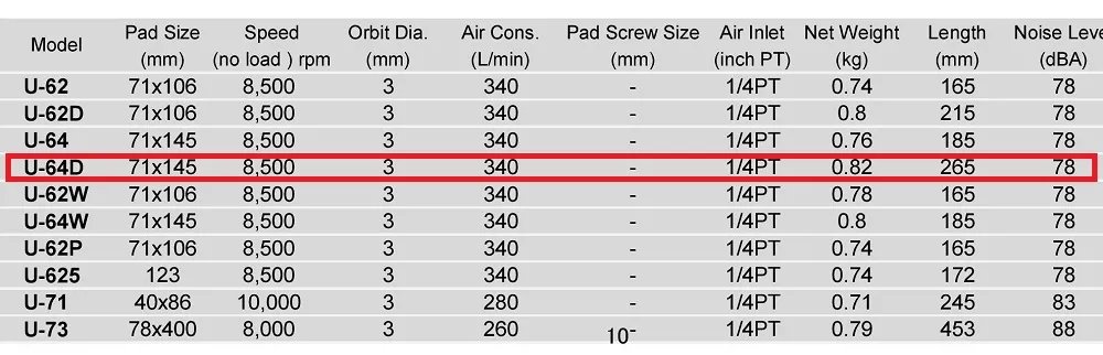 High efficiency by strong motor, low vibration and low gravity center. Less fatigue by well-balanced ergonomical design. Dust free orbital sander 71mm x 145mm with speed regulator & air exhaust hose 1.6m
