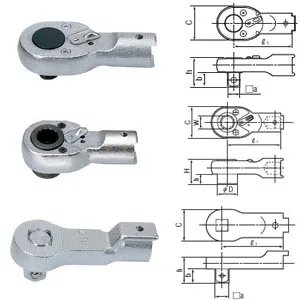 • The SH type spanner heads suit for the place where sockets can not be used, for flare nuts in piping and for work in narrow places. • Notched head enables quick motion of tightening, saving the trouble of removing the head from the nut each time of tightening. The SH-N series are ideal for brake lines. • The RH type ring heads guarantee the safe work as the axes of bolt and RH ring head are always aligned and prevent the heads will drop. • As the QH type ratchet heads need only small swing for tightening, they suit for operations in narrow spaces. • As the RQH type ratchet heads need only small swing for tightening, they suit for operations in narrow and low ceiling spaces. • The DH square drive heads are the standard interchangeable head. They are useful when tightening a large number of matching screws with a common torque wrench. It is recommended to keep one set. They are used with sockets. • The HH hex-head is for hex. socket head cap screws. • The AH type heads are inner-width adjustable and suitable for hydraulic or pneumatic pipe tightening, maintenance works, inch size screw management, etc.