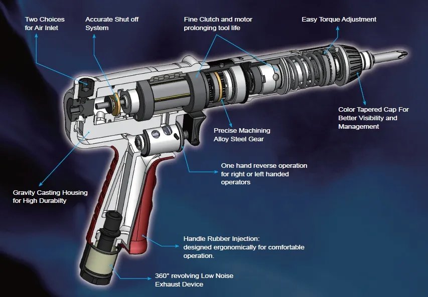TDBS Screwdriver is a pneumatic clutch shut-off tool with accurate and repeatable torque output.
