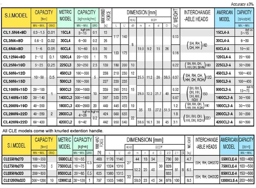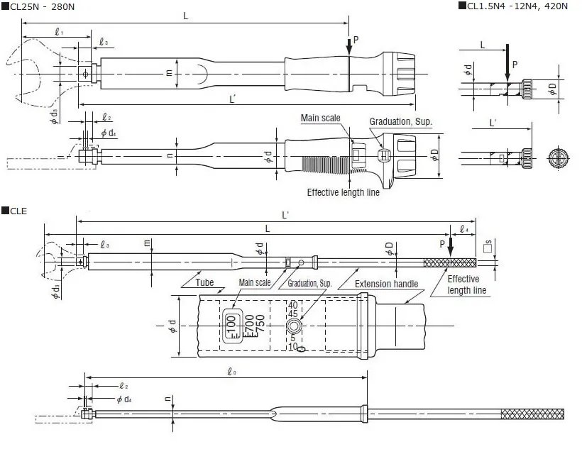 • Interchangeable head version of QL type. • Open end spanner, ring, square drive, ratchet, hex heads can be used as needed. A cost saving wrench. • A click will signal that the proper amount of torque has been applied. • Easy torque setting by graduation. • With resin grip for CL25N - 280N. • E-type models are with an extension handle. • AH(Adjustable head) type exchangeable heads are available for CL50NX15D, CL100NX15D and CL140NX15D. AH adjustable head.Click here. • Applicable to use in the EU region. Comply with calibration procedures of ISO6789 Type II Class A.